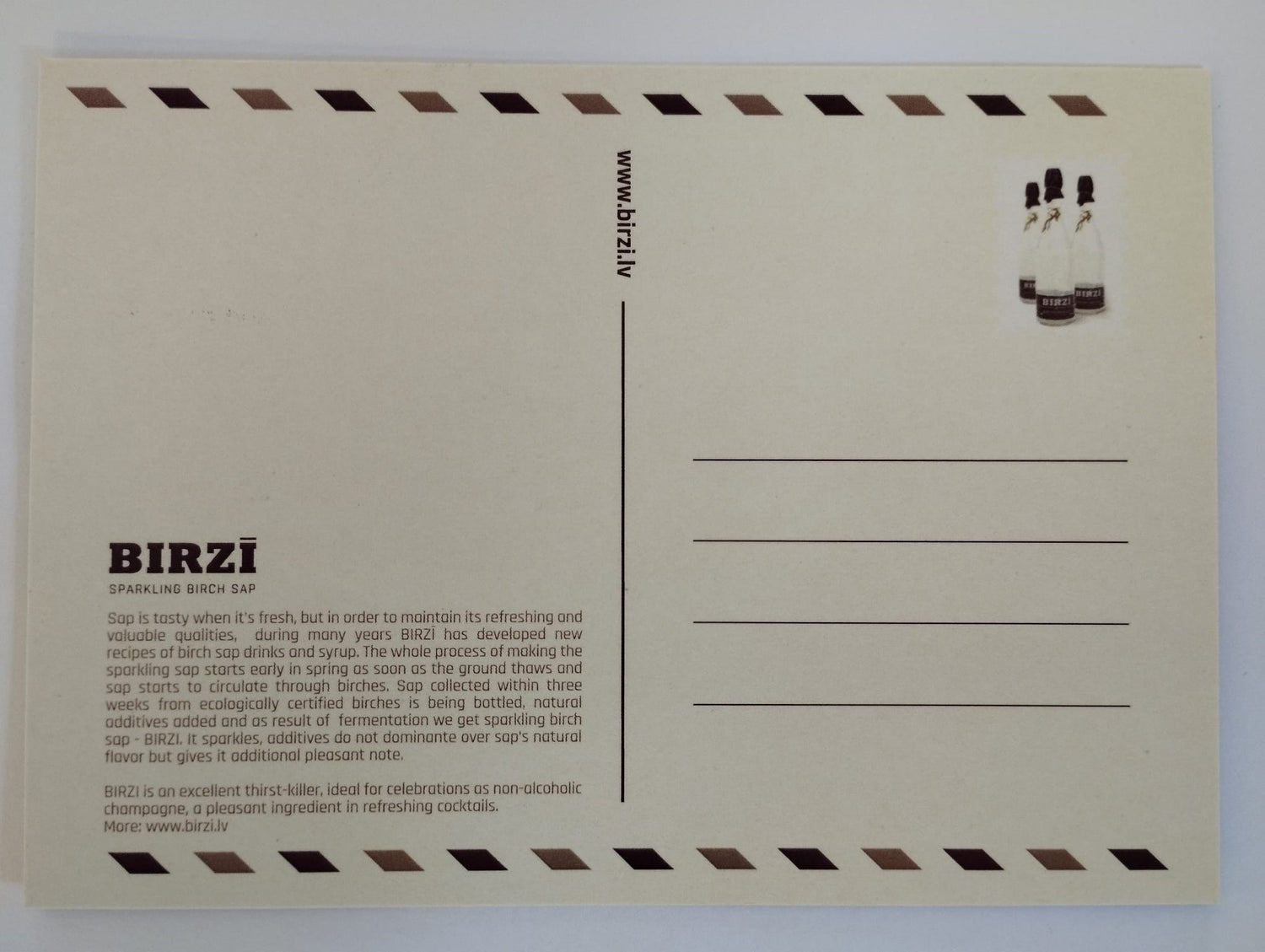 Papildiniet savu pasūtījumu ar skaistu pastkarti, kurā redzami BIRZĪ bērzu meži sulu vākšanas laikā. Varam arī pievienot sveicienu jūsu vārdā, ja sūtiet to kā dāvanu kādam!