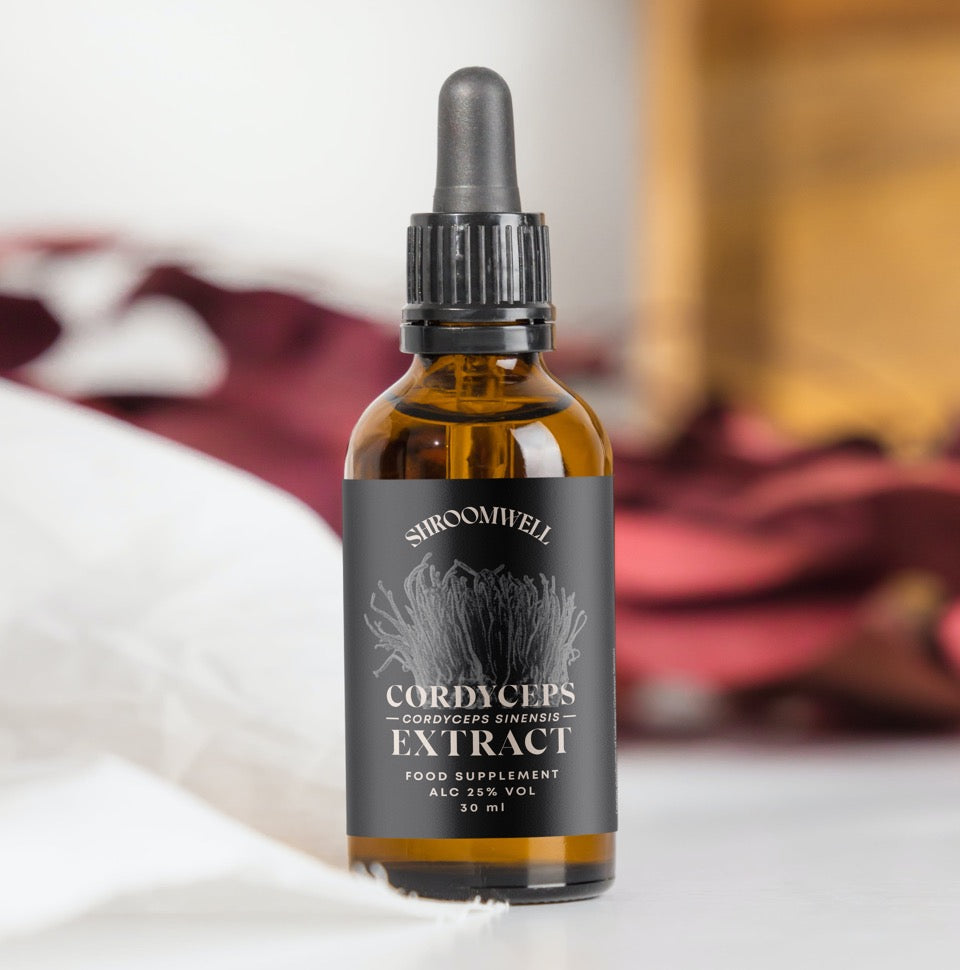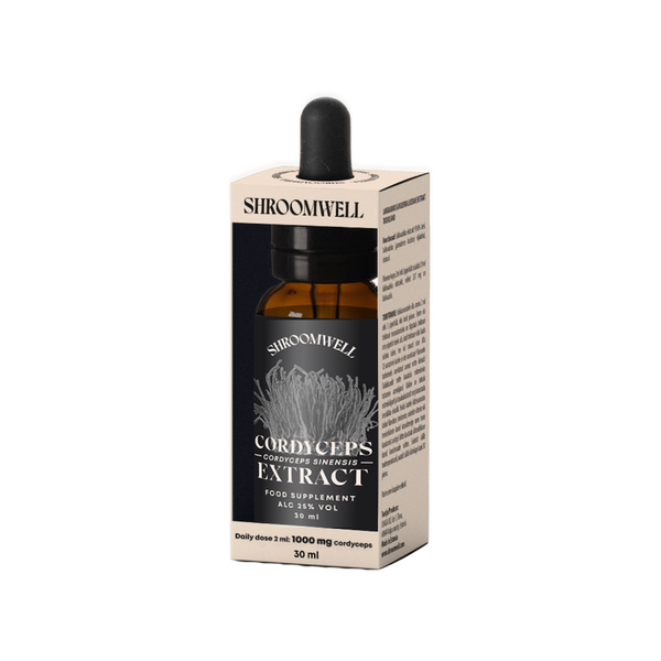 Kordiceps sēnes ekstrakts ( ūdens, kordiceps sēnes (Cordyceps sinensis) augļķermenis), etanols. Alc. 25 tilp. %.